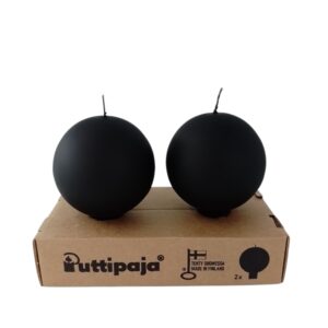 Jalallinen pallokynttilä mattamusta 2 kpl/pkt (erä) Upea mattapintainen pallokynttilä. Pallokynttilät myydään kahden kynttilän paketissa. Huomaathan, että tuotetta on myynnissä vain varainhankinnan verkkokaupan kautta rajallinen määrä. Kun varasto on myyty loppuun, tuotetta ei voi enää tilata. Väri: metallinen mattamusta Materiaali: parafiini Tuoksu: tuoksuton Koko: Kynttilän halkaisija 6 cm. Kynttilän kannan korkeus 2 cm ja halkaisija noin 1,5 cm Kynttilän paloaika: ~12 h Myyntierä: 2kpl/laatikossa Hinta: 13 €