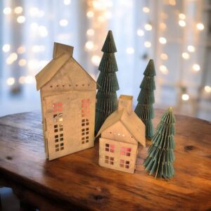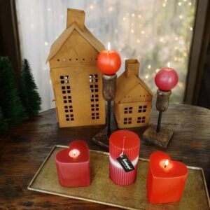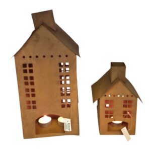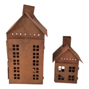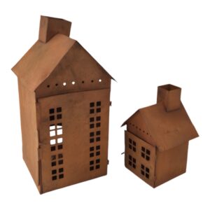 Ihana ruosteenvärinen metallitalo tuo valoa ja kodikkuutta hämärtyviin iltoihin. Kynttilän lämmin valo siivilöityy kauniisti talon ruutuikkunoista ja luo tunnelmallisen hetken. Talo sopii täydellisesti syksyn ja joulunajan tunnelmanluojaksi, ja sen aukeavan oven ansiosta tuikku on helppo asettaa sisään.