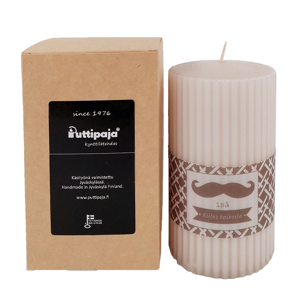Veikeällä isänpäivä-aiheisella vyötteellä koristellulla vekkikynttilällä riemastutat isää ja isoisää.